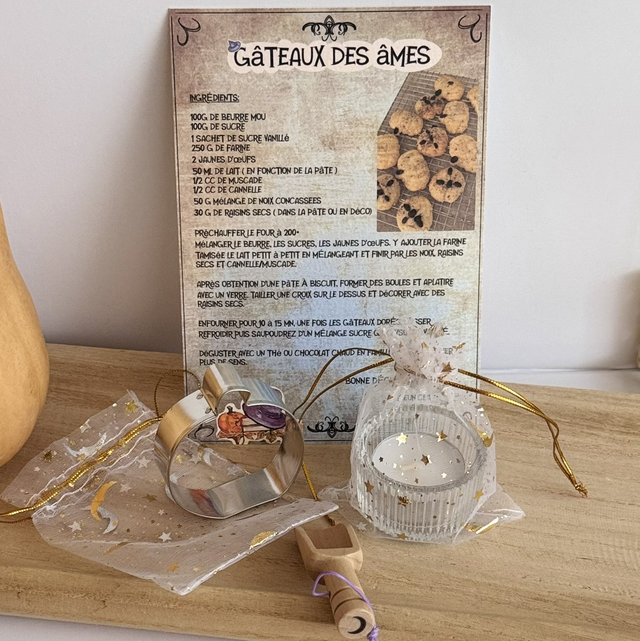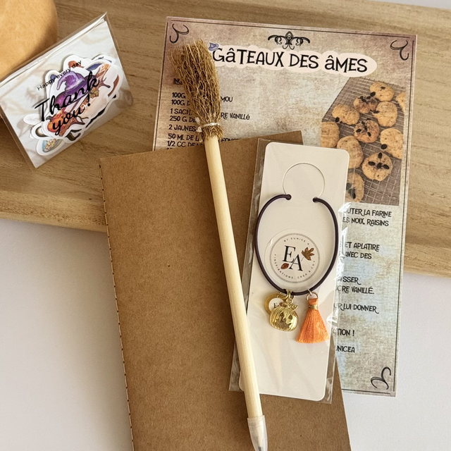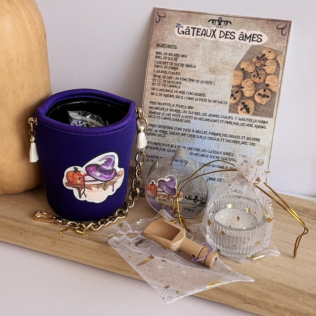 1 manchon a mug, une coffret de 3 marque-pages magnétiques, 1 marque-page élastique, une recette de gâteau, un emporte-pièce de forme aléatoire, une bougie réchaud, une cuillère en bois à épicé et un cahier A6 avec son crayon balai.