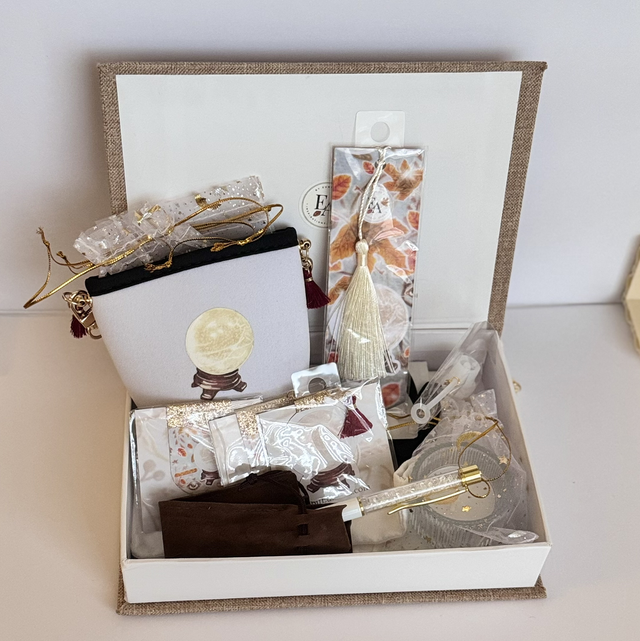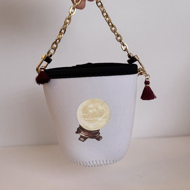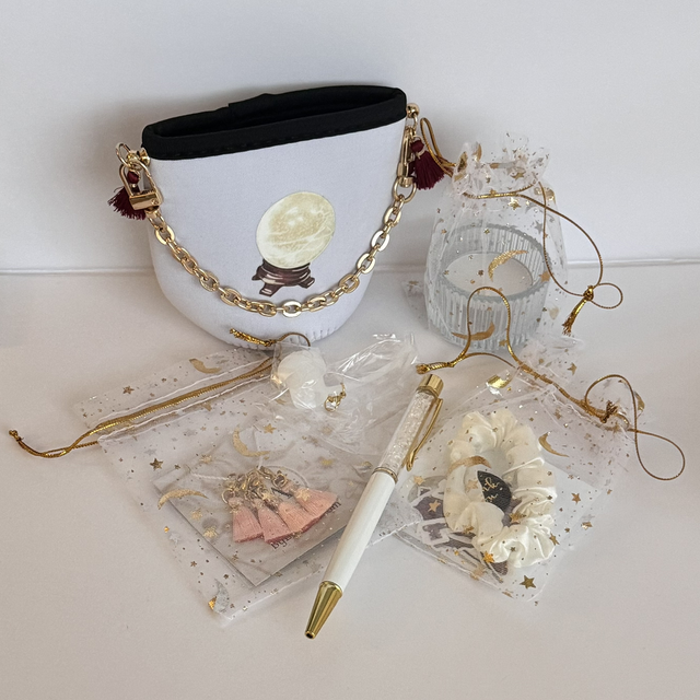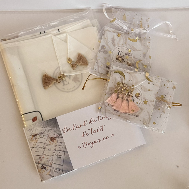 Plongez dans dans le monde du développement personnel avec le foulard Voyance aux multiples usages, comme tapis de jeux de Tarots ou Oracles, en accessoire de sac ou en accessoire de tête. Dans une boîte de rangement personnalisées à la main de style grimoire, il sera facile d’y ranger ses petites affaires, pour les sessions de tirage.