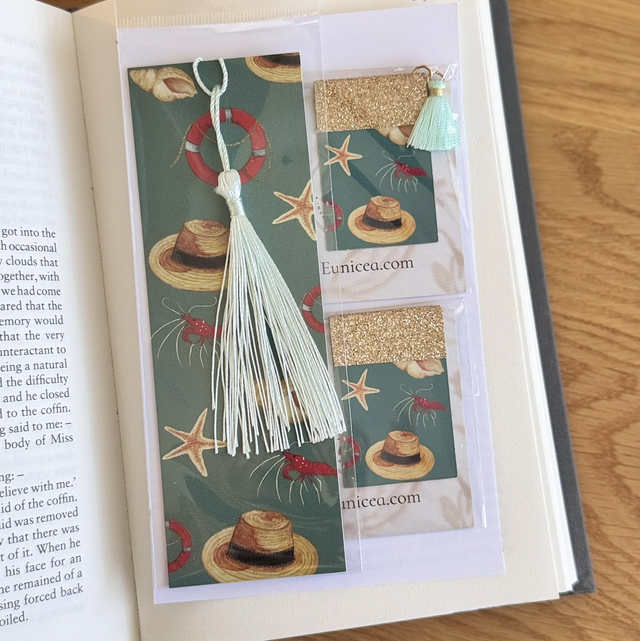 Chaque marque-page magnétique mesure 5 cm fermé, agrémenté d’un pompon de couleur et d’un liseré pailleté.