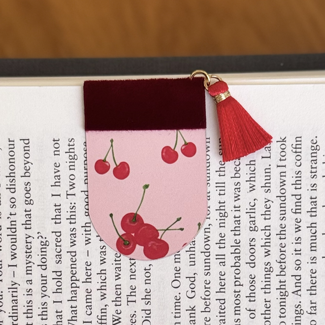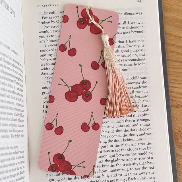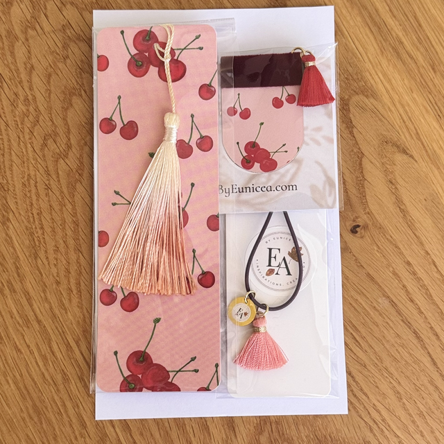 Offrez à vos lectures une parenthèse de douceur avec ce marque-page raffiné, illustré de cerises à l’aquarelle aux couleurs intenses. Chaque détail est soigneusement pensé : un toucher soft velouté qui invite les doigts à s’attarder, et un pompon nuancé de deux teintes assorties qui dansent au rythme des pages tournées.